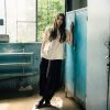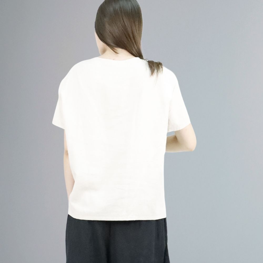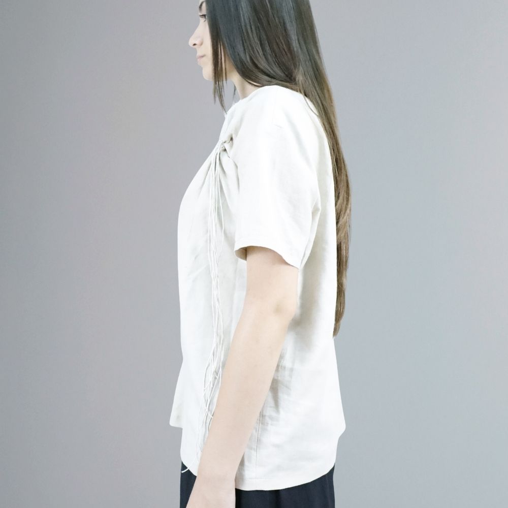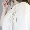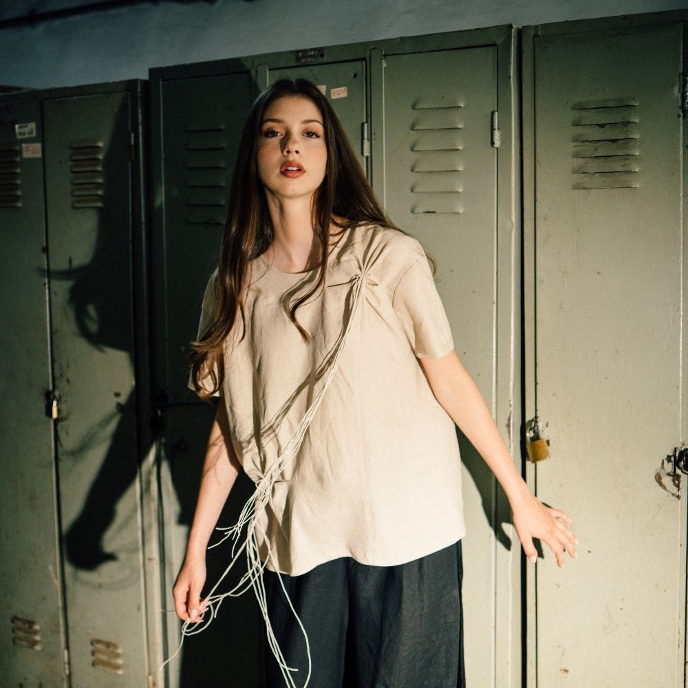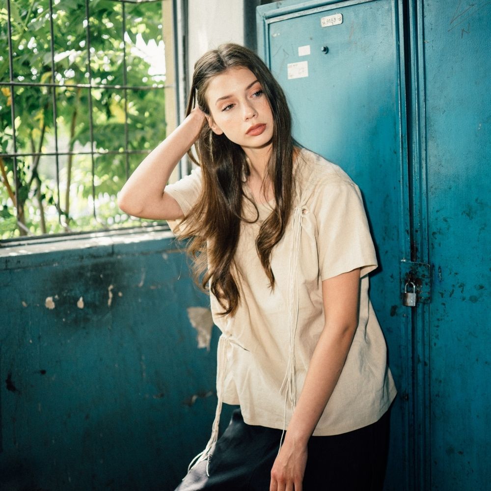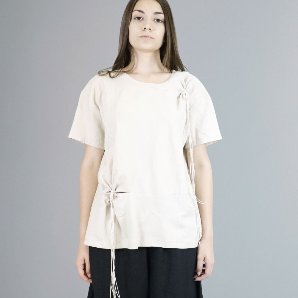 Women’s shirt made of beige textile material and natural leather inserts.