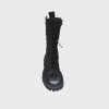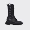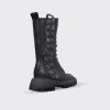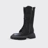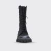 Cizme de dama confectionate din piele naturala intoarsa, captusite cu piele naturala si finisate manual cu vopsea de culoare neagra. Design-ul cizmelor este unul deosebit cu detalii unice. Pentru a facilita incaltarea, ghetele au atat inchidere cu fermoar pe partea laterala cat si sireturi pe partea din fata. Talpa ghetelor este una inalta, de culoare neagra, iar varful lor este rotunjit.