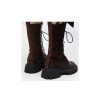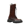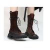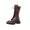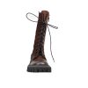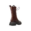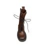 Cizme de dama confectionate din piele naturala, captusite cu piele naturala si finisate manual cu vopsea de culoare maro. Design-ul cizmelor este unul deosebit cu detalii unice. Pentru a facilita incaltarea, ghetele au atat inchidere cu fermoar pe partea laterala cat si sireturi pe partea din fata. Talpa ghetelor este una inalta, de culoare neagra, iar varful lor este rotunjit.