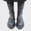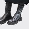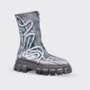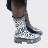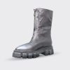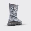 Cizme de dama scurte, confectionate din piele naturala, finisate manual cu vopsea alba. Cizmele au varf ascutit si fermoar pe mijloc iar talpa este inalta si zimtata.