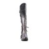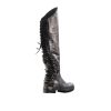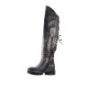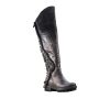 Cizme de dama realizate din piele naturala de culoare neagra si patinata cu argintiu. Partea posterioara a cizmelor este decorata cu blanita si siret. Sunt prevazute cu fermoar pe partea laterala interioara, pentru o incaltare mai facila.