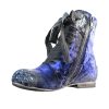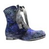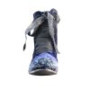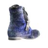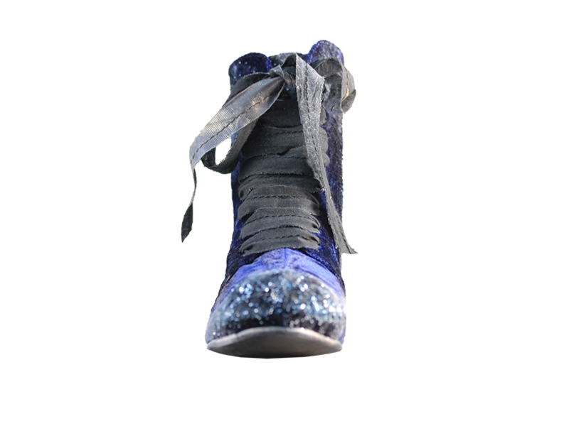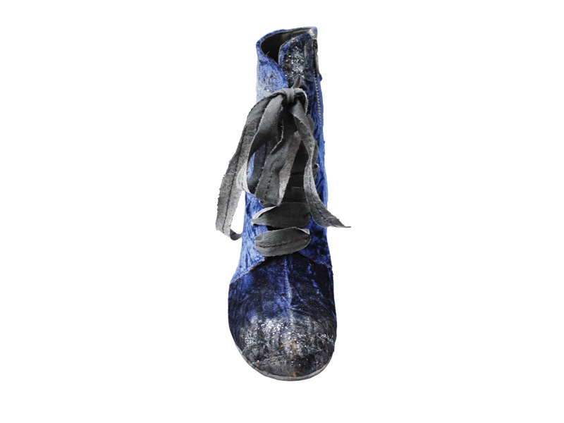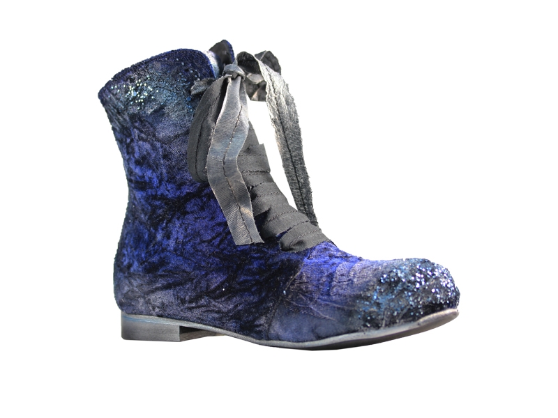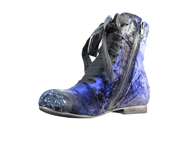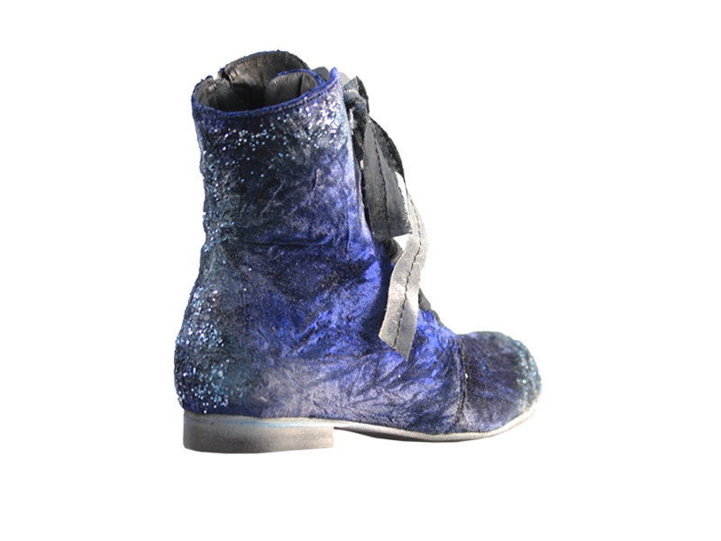 Ghete realizate din piele naturala si catifea, cu sireturi. Finisate si patinate cu vopsea de culoare argintie si cu sclipici. Sunt prevazute cu fermoar in partea laterala, pentru o incaltare mai facila.
