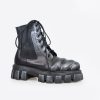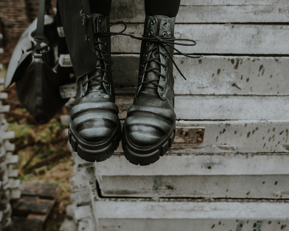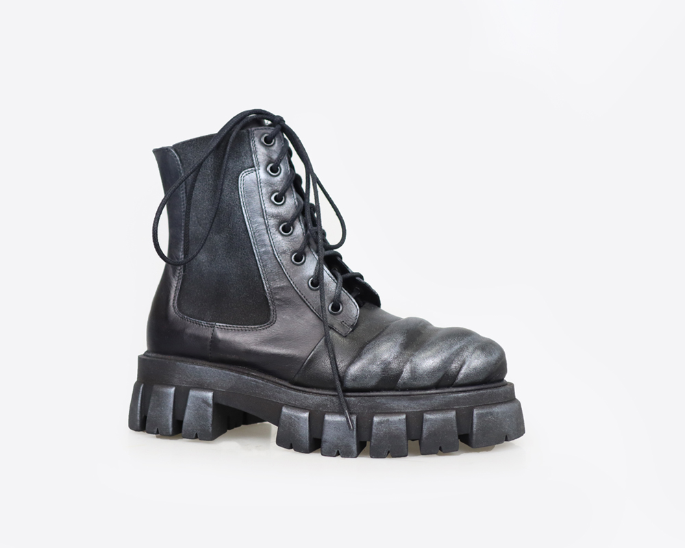 Ghete de dama realizate din piele naturala finisate manual cu vopsea neagra. Pentru a facilita incaltarea ghetele au o banda elastica pe laterale si sireturi. Talpa este inalta, de culoare neagra iar varful este ascutit.