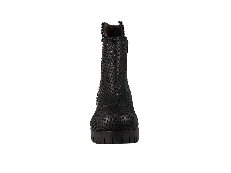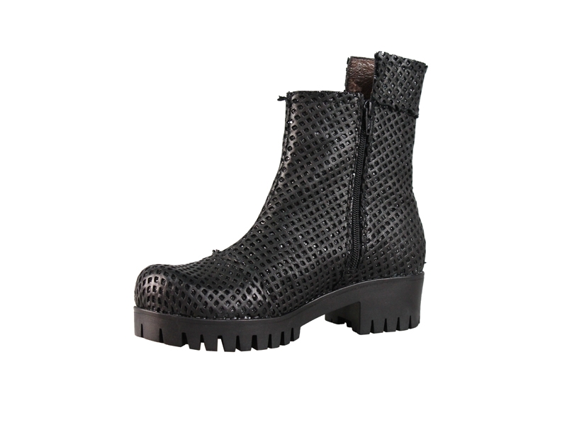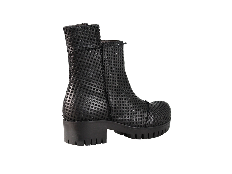 Ghete realizate din piele naturala, perforata, de culoare neagra si din piele decorata cu sclipici si pozitionata dedesubtul stratului superior. Sunt prevazute cu fermoar pe partea laterala interioara, pentru o incaltare mai facila.
