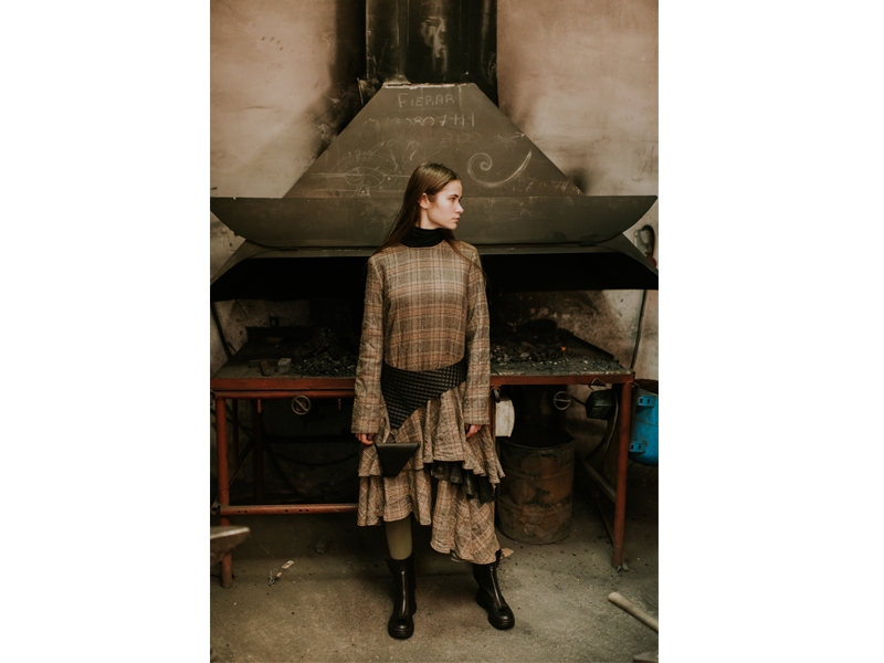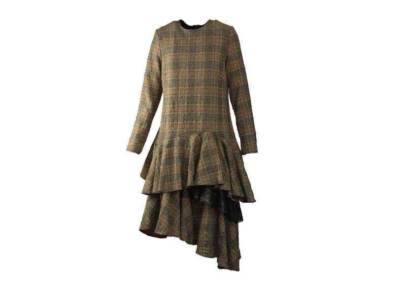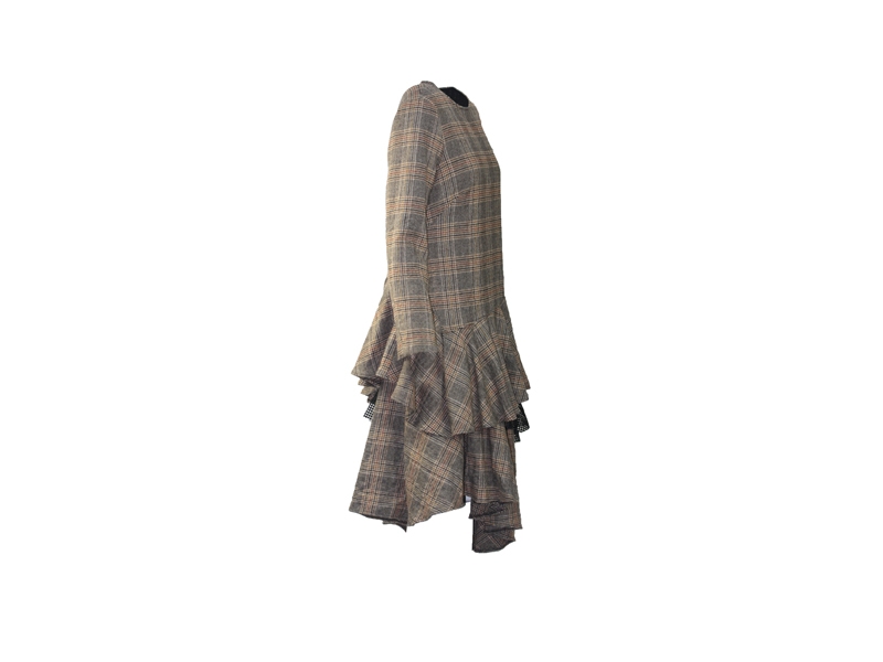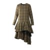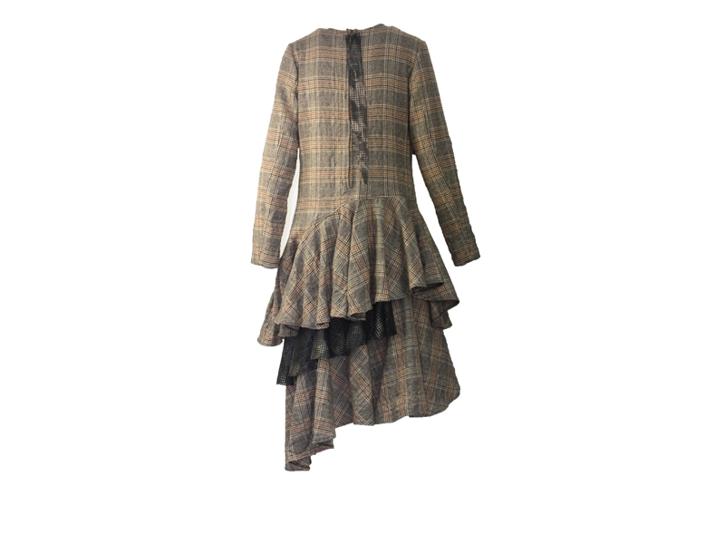 Rochie de dama realizata din material textil in carouri si piele neagra perforata.