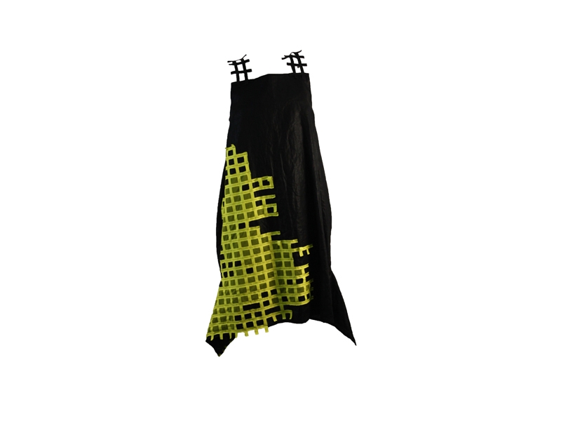 Rochia este prevazuta cu bretele negre si este accesorizata cu forme geometrice galbene.