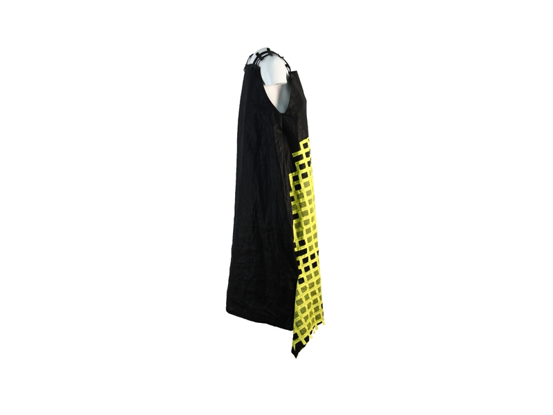 Rochie de dama realizata din material textil negru-galben.